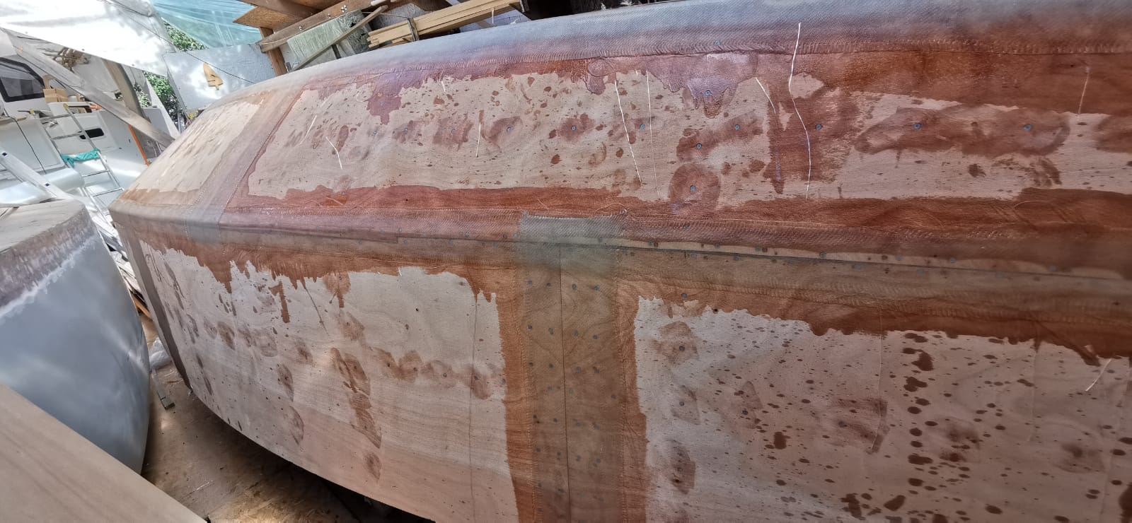 The edges are already rounded, fabric stripes prepared. We can laminate.